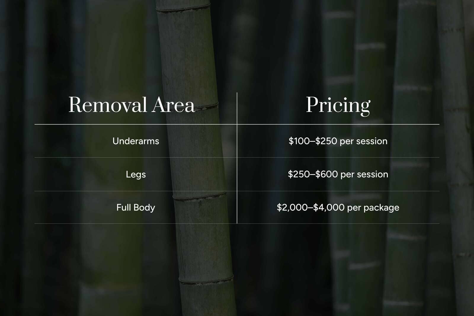Brazilian treatments typically cost more than smaller areas like the underarms or upper lip but less than full-body packages. For comparison: